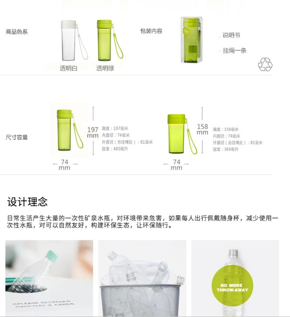 產品特點:傾斜防漏,堅固耐用,無毒塑料;熱水飲用無異味,低溫不易碎