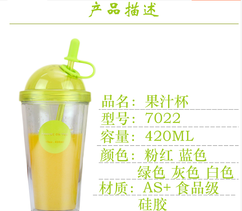 產(chǎn)品特點:AS食品級材質,420M容量,多種顏色選擇,雙層果汁杯、牛奶杯